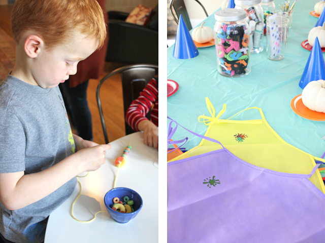 Craft projects: first things first, I covered the table with a big disposable tablecloth, and put out aprons to keep the kids from getting too messy (which I decorated with temporary tattoos - so fun!). Then I set out jars with all of our favorite craft supplies: acrylic paints, paint brushes, washi tape, googly eyes, felt letters, assorted pom poms, and glue. To decorate, we had some party hats along with some cute little white pumpkins I got at the farmer's market for 50 cents each. And then all of these Montessori classmates know the necklace "work" where they string on noodles and such - so I thought they would love a Froot Loops + peach rings edible necklace craft. I just put out some supplies in little bowls and some yarn from my craft stash, and that occupied them all for a bit longer as well!