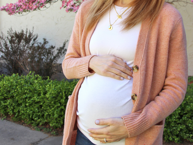I keep talking about dress weather, because that is ideal for pregnancy style, but we're not getting much of it with this fickle and relatively chilly spring season - so here's been my actual uniform: maternity jeans + tee with a cardigan. Basic? Definitely. Boring? Well, at least there's cute shoes to add some interest and pretty trees in bloom for a backdrop...