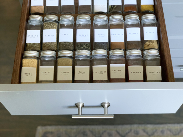 In the kitchen, I have used OXO canisters to keep the pantry organized for years - they were a bit of an investment (though, pro tip: sometimes you can find them for a great price at TJ Maxx or Home Goods), but they have held up for nearly 10 years, so they're very worth it! The ones in my baking drawer have labels on top for easy access to everything. And I've done a whole post on my spice drawer organization - pretty much one of my favorite things of 2020.